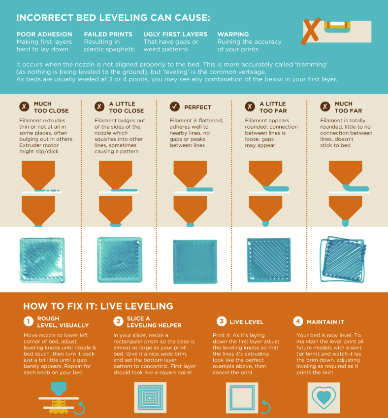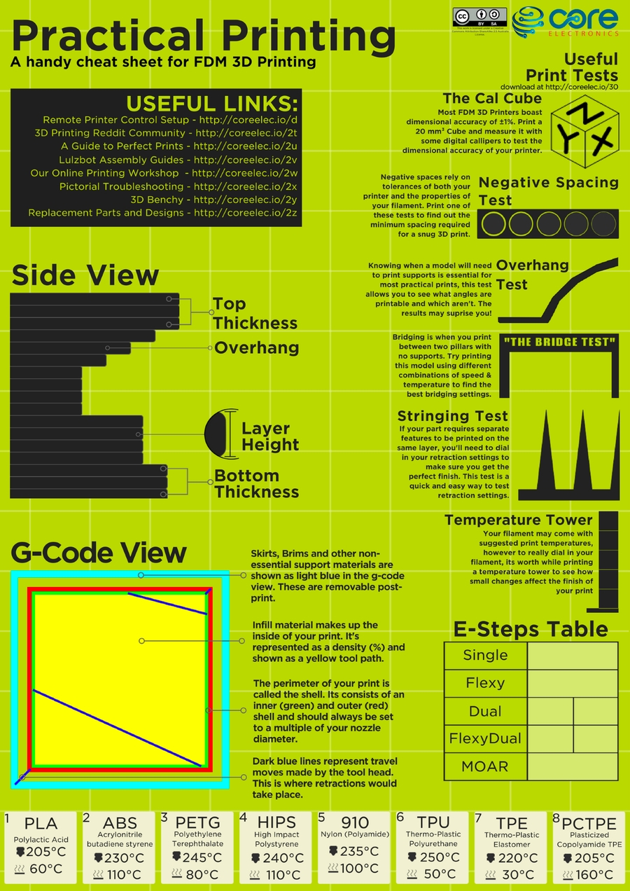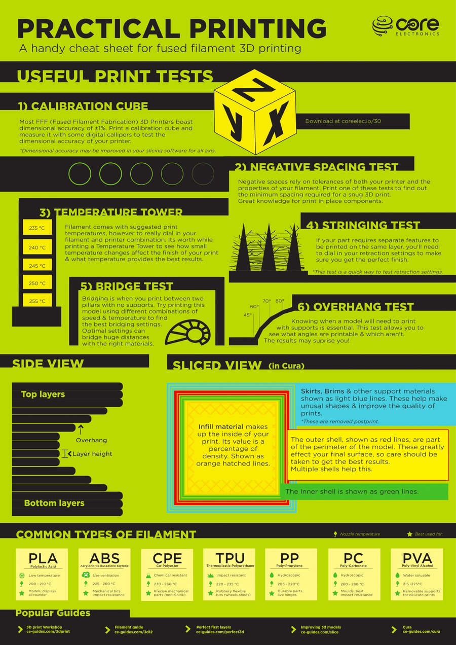 A continuación os vamos a sugerir, por orden, los tests y ajustes que pensamos interesantes para la calibración de nuestra impresora 3D. En todo caso, y aunque está en inglés, os aconsejamos este "cheat sheet" de core-electronics muy visual que nos puede ser de gran utilidad: