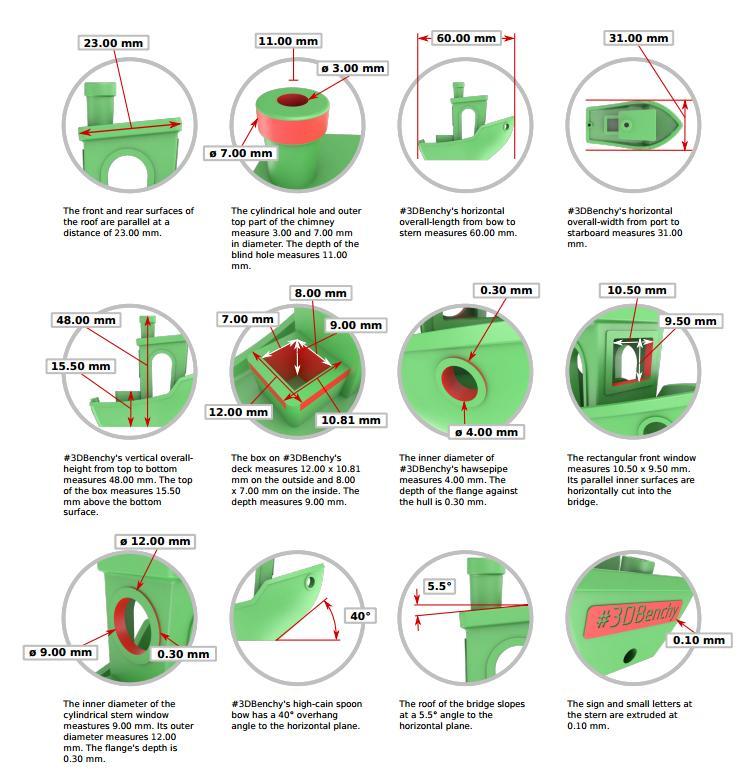 Este test ayudará a verificar; - test de voladizos, donde nos indicará en wue angulos nuestra impresora piede imprimir sin soportes para configurar en tu slider y evitar/minimizar el número de soportes necesarios - test de puentes, para ver los límites en distancia de puentes - test retracción - test definicion esquinas - test de tolerancia - test de escala