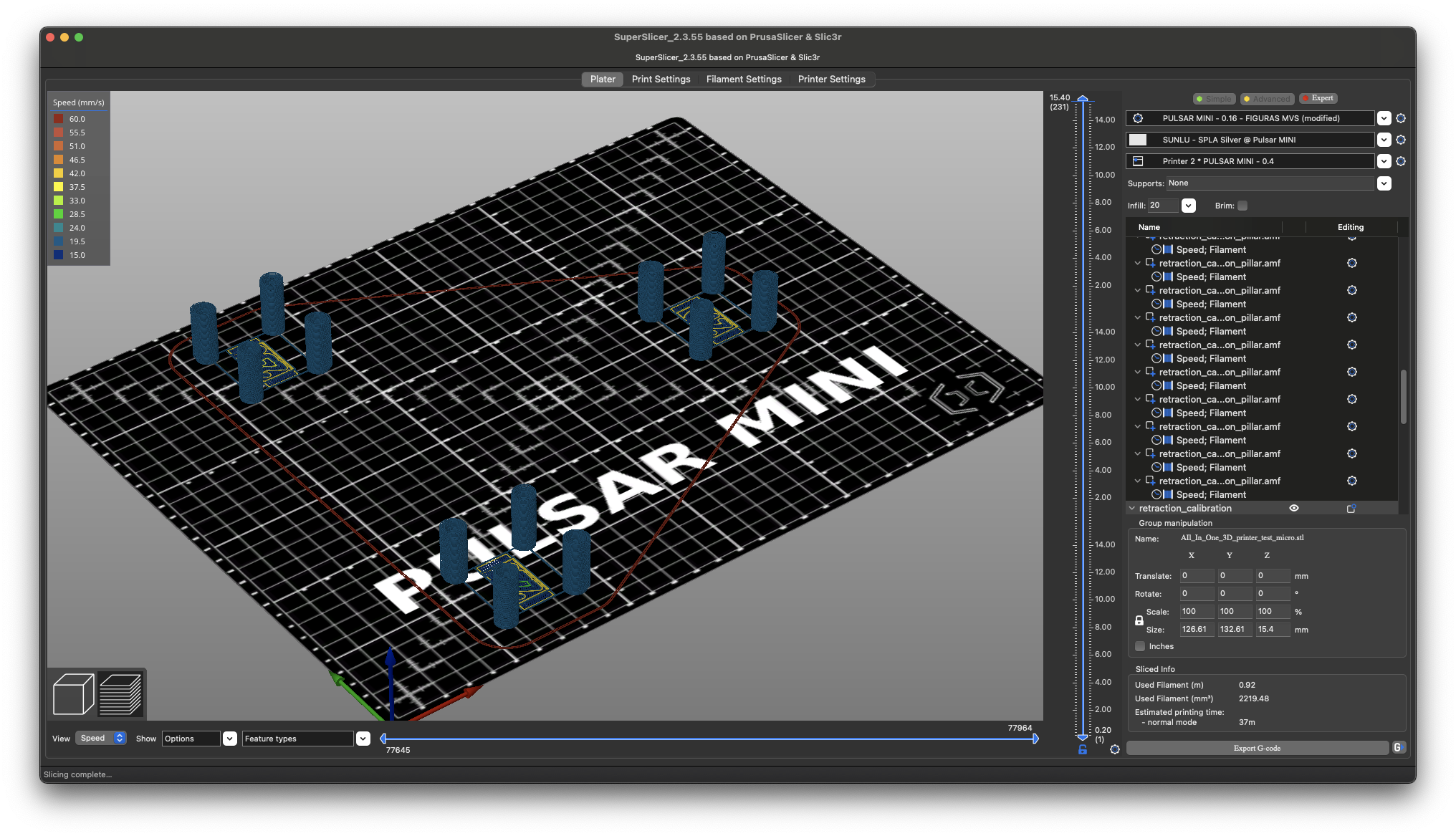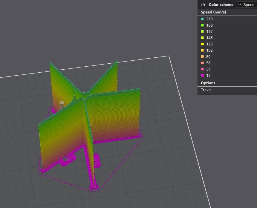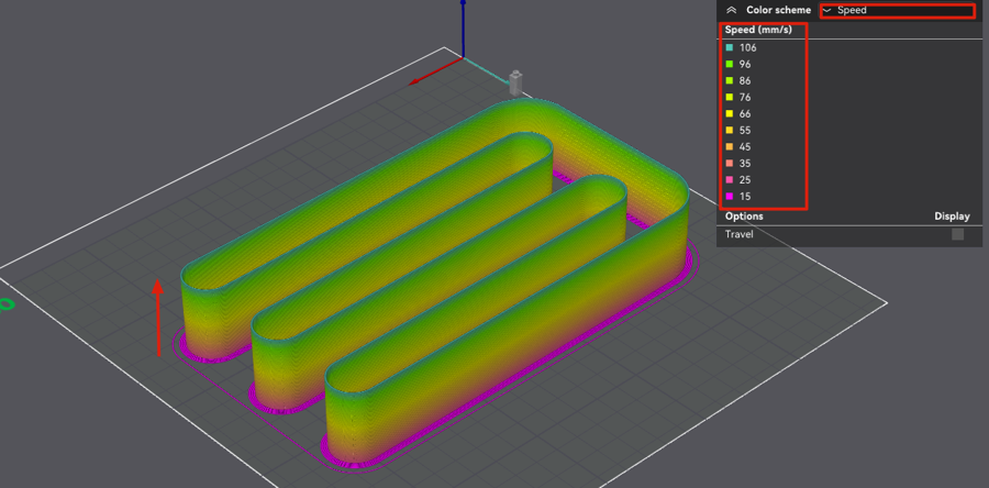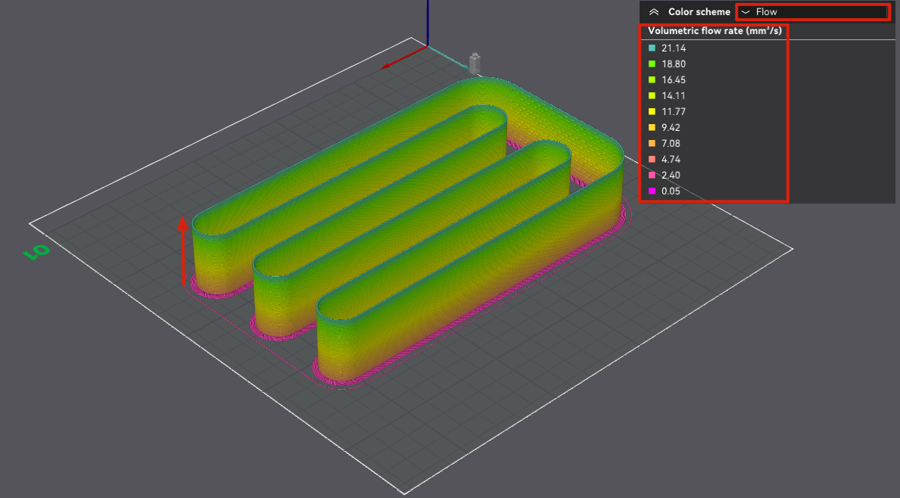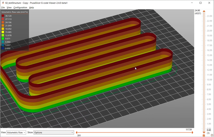 Ya tendremos nuestro test listo para imprimir, es aconsejable revisar el preview con la vista de velocidad y flow para verificar que es correcto: