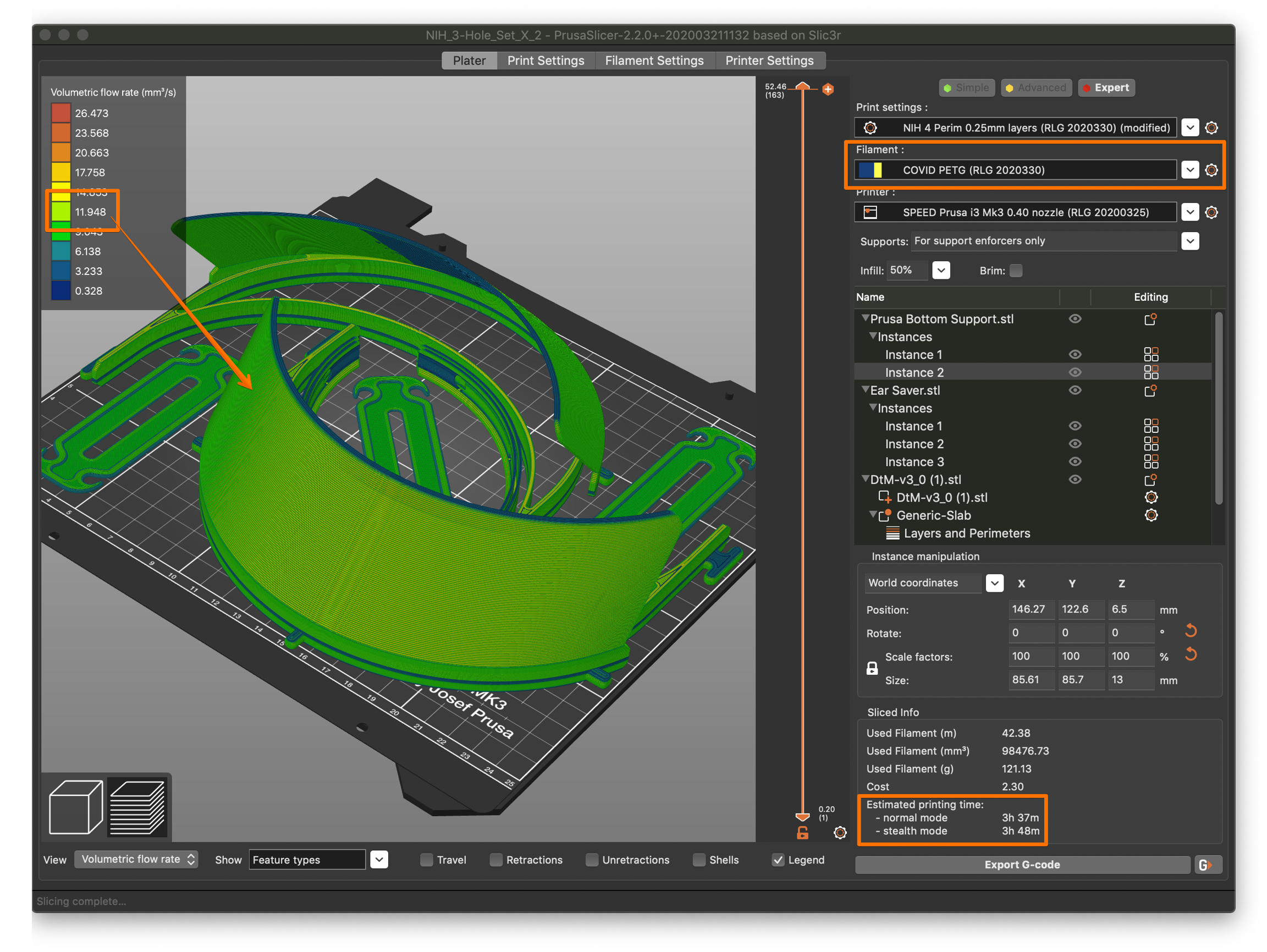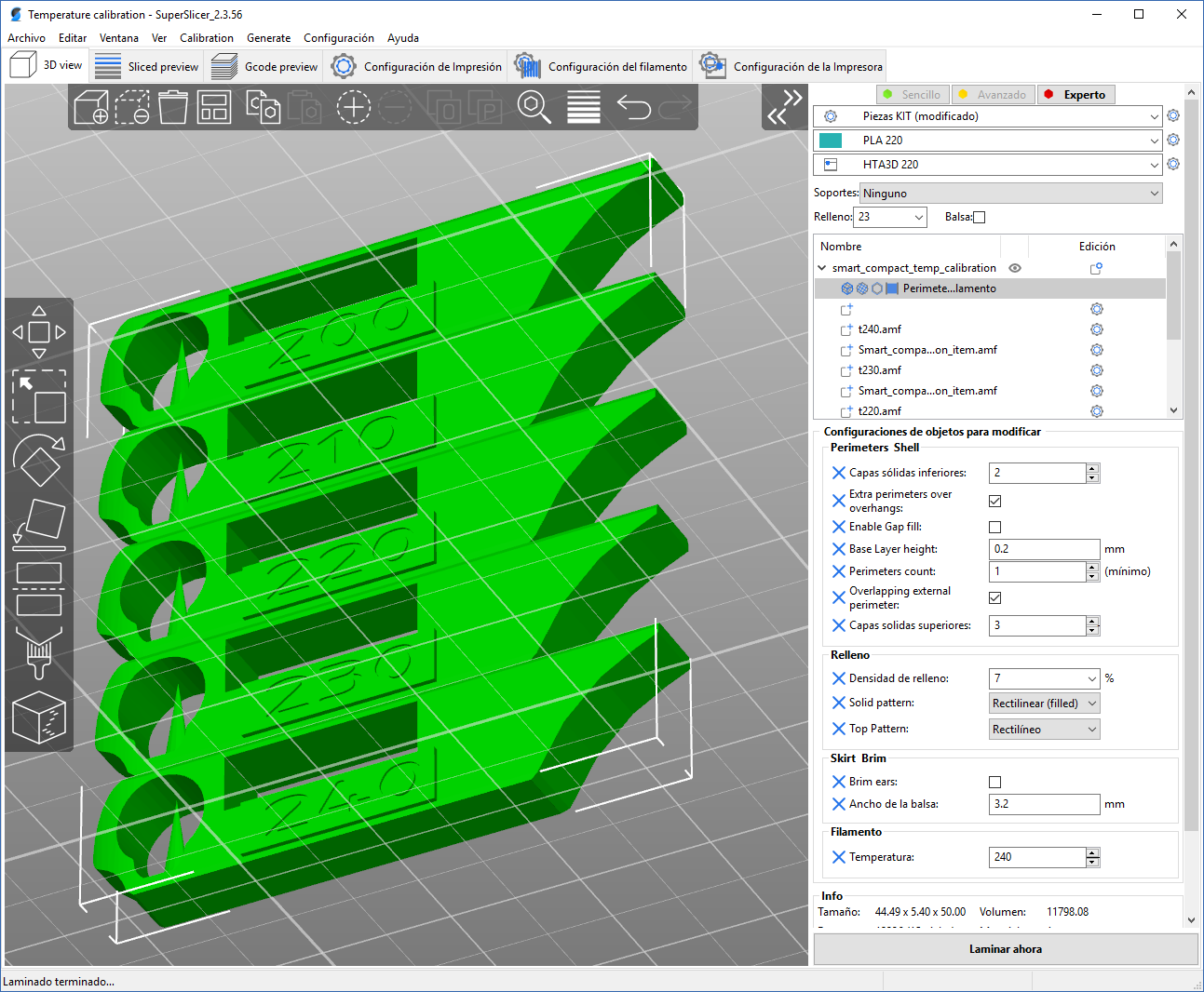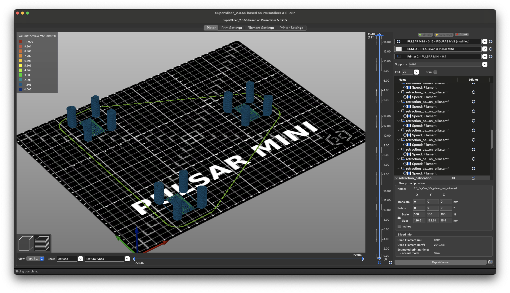 Ya tendremos nuestro test listo para imprimir, es aconsejable revisar el preview con la vista de velocidad y flow para verificar que es correcto: