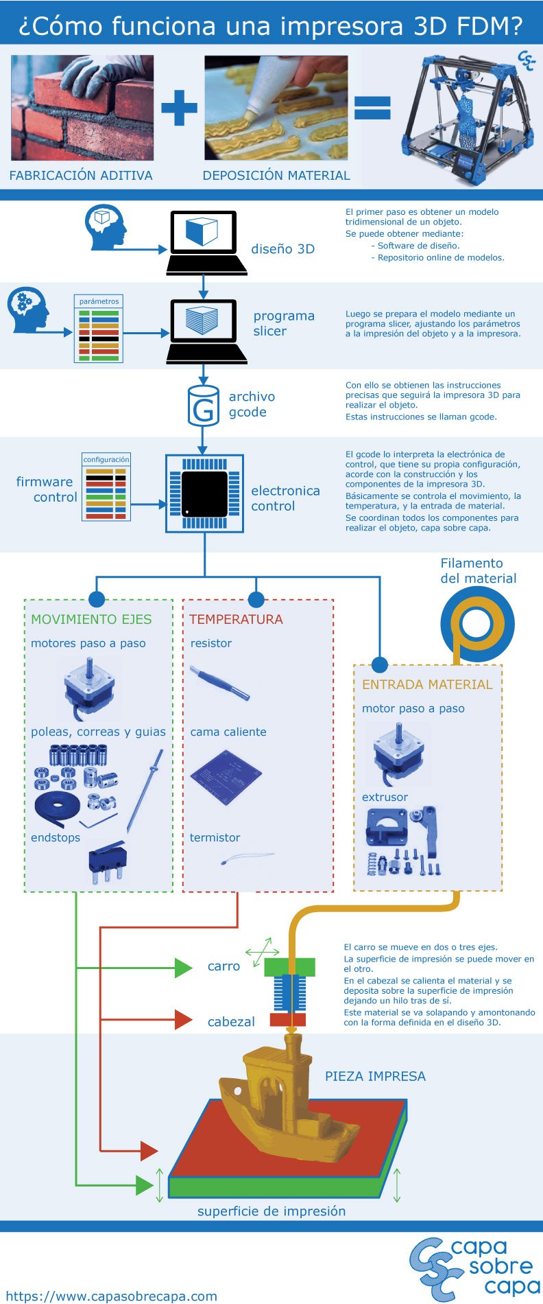 Aunque probablemente muchos de vosotros sepáis como funciona una impresora FDM puede ser instructivo para algunos repasar a grandes rasgos como es su funcionamiento. La siguiente infografía, aunque algo antigua, creemos que refleja de una forma bastante sencilla y clara el funcionamiento general de esta tecnología de impresión 3D: