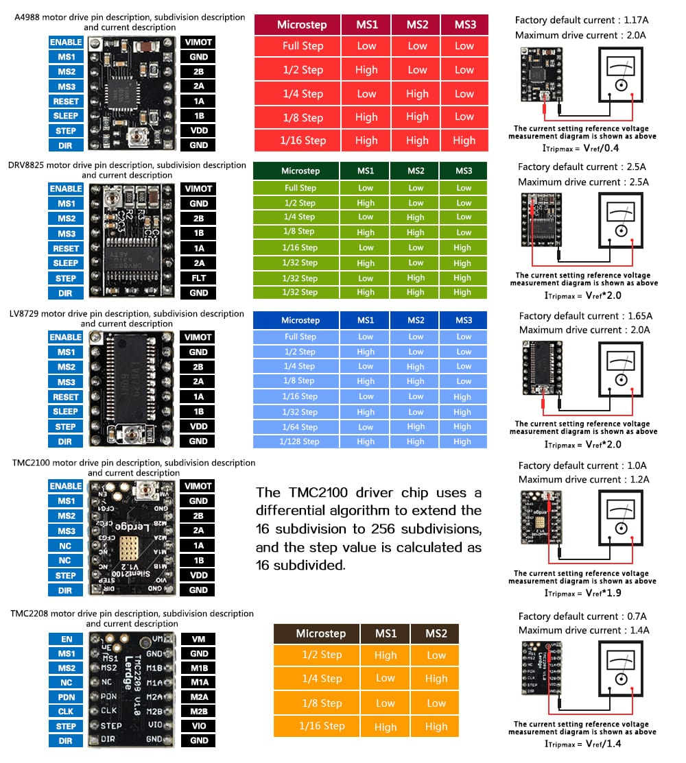 Es muy importante que en el caso de cambio de drivers o motores tengamos en cuenta las características de los mismos y las capacidades de los drivers. Como ejemplo revisa la siguiente lista sobre los A soportados por estos tipos de drivers listando algunos a modo de ejemplo:
