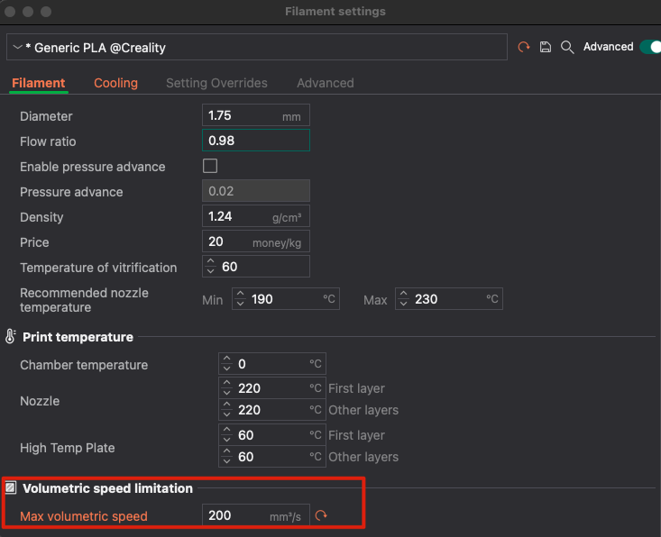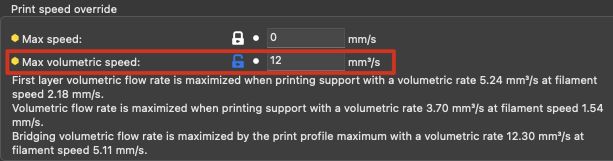 En nuestro perfil de filamentos ajustaremos Max Volumetric Speed