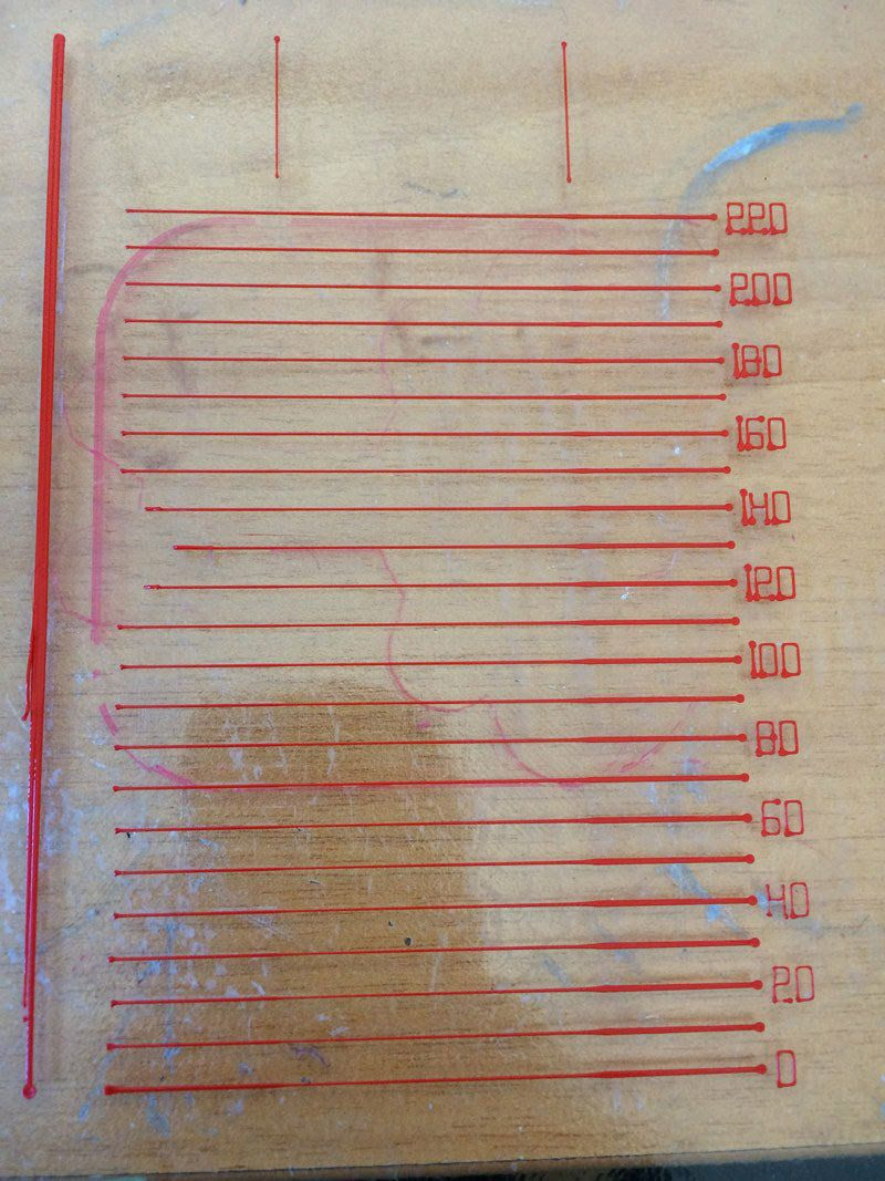 Incrementaremos la velocidad de 100mm/min (el valor Fxxx) hasta que escuchemos que nuestro extrusor empieza a perder pasos