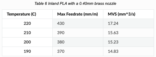 A modo de referencia podéis encontrar en la siguiente tabla unos valores por tipo de hotend/extrusor (con boquilla 0.4 y filamento 1.75):