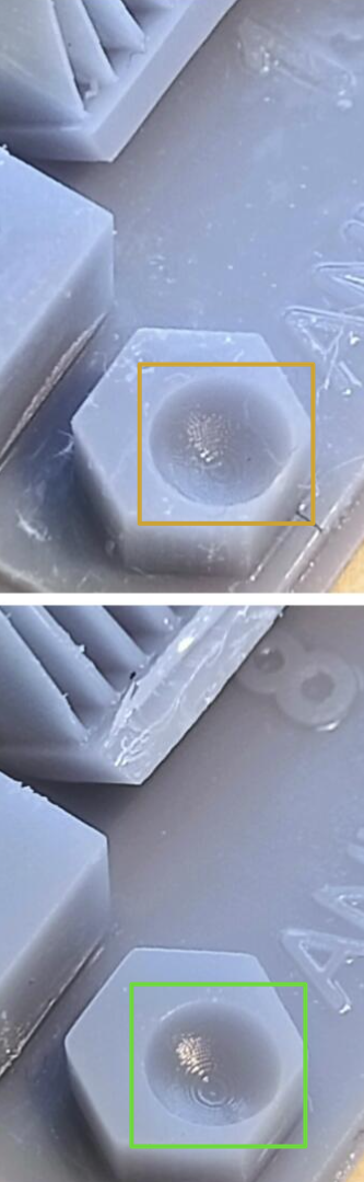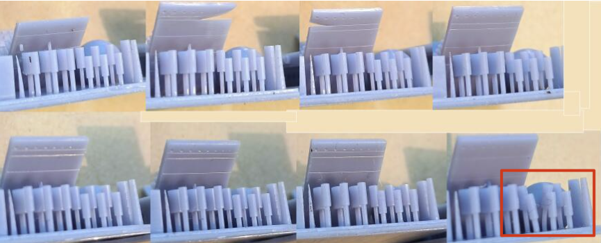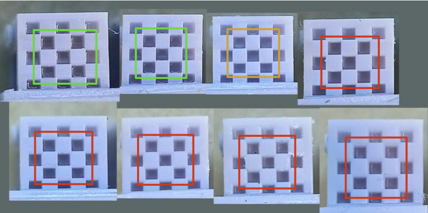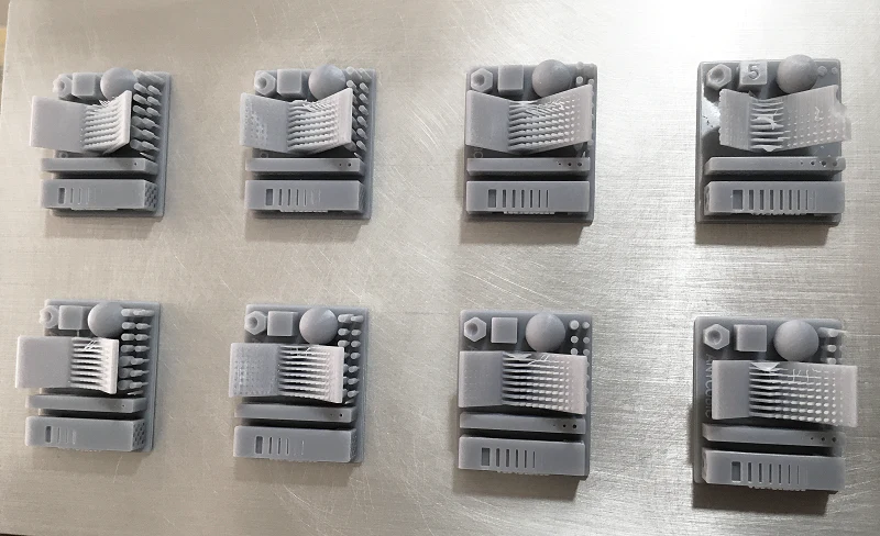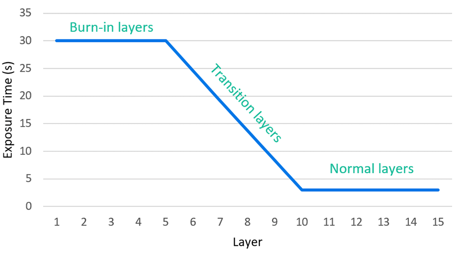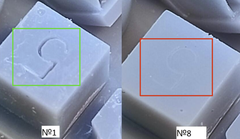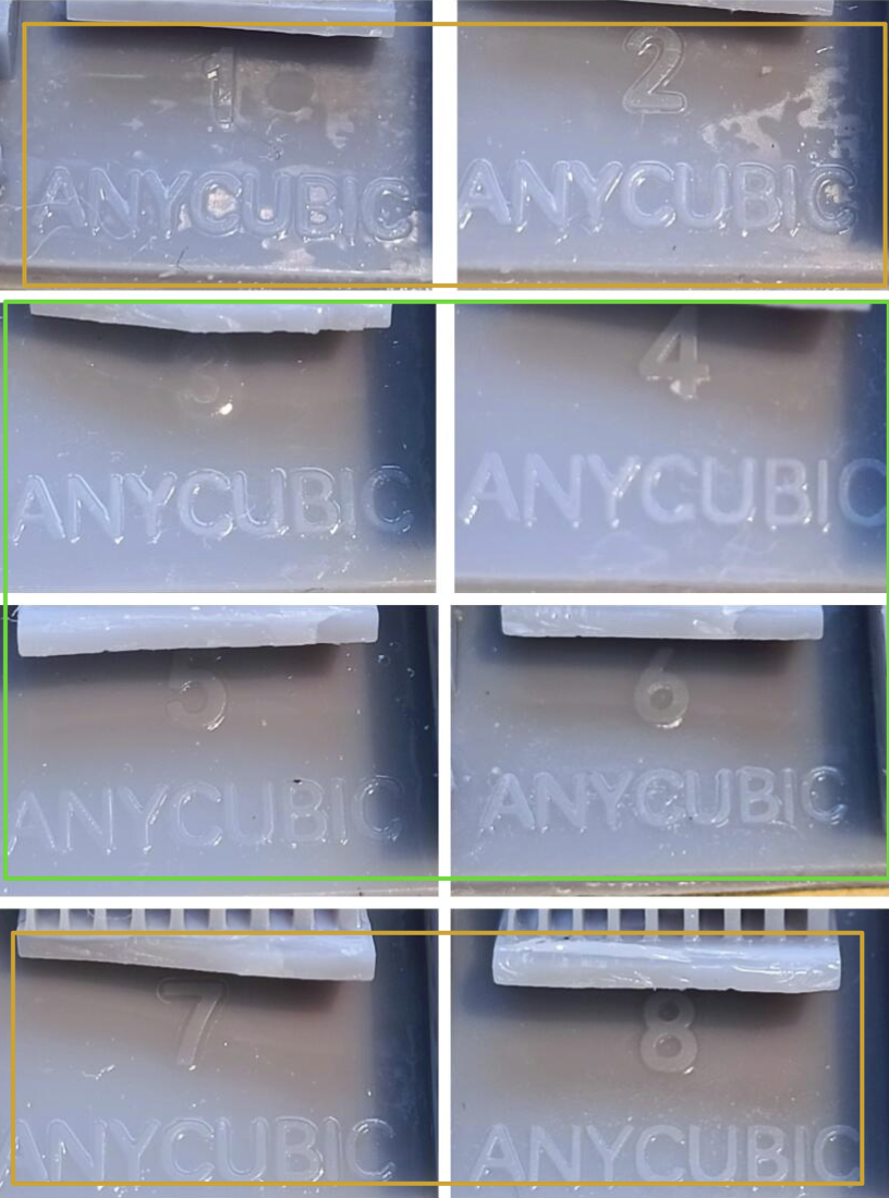 * podemos de ir ajustando nuestra exposición de capas base reduciendo 5s en cada test para encontrar un balance entre baja (no se adhieren las piezas) o alta adherencia (cuesta retirar las piezas).