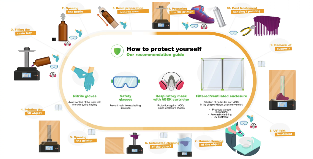 En la siguiente imagen podéis ver, con respecto a los diferentes pasos o procesos de impresión en resina, cuando es obligatorio el uso de uno o varios sistemas de protección: