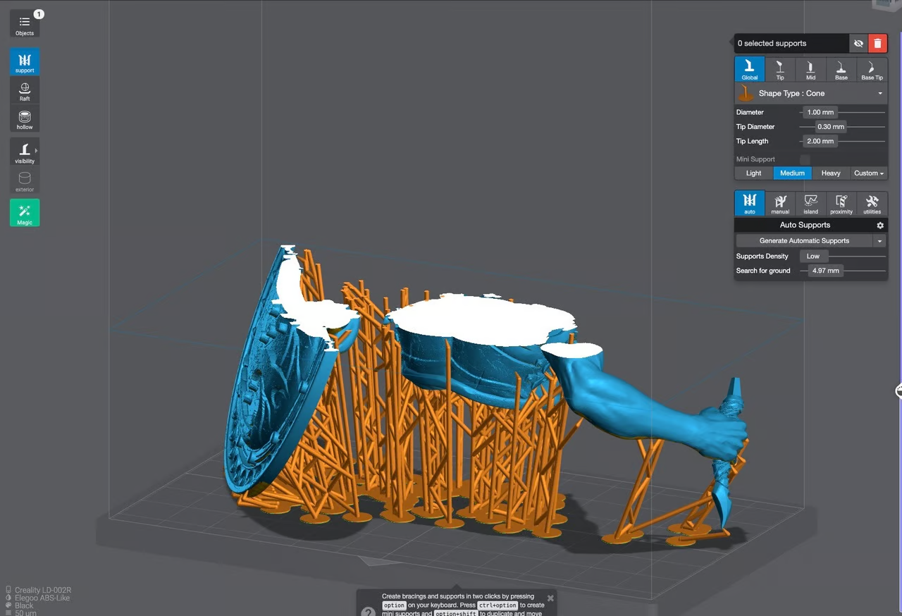 Normalmente todas nuestras impresiones de resina van a necesitar soportes y es en este paso donde los retiraremos usando un cutter o alicates de corte finos. El paso anterior junto con un buen trabajo en el laminador a la hora de poner los soportes marcará la calidad final de nuestra pieza.\