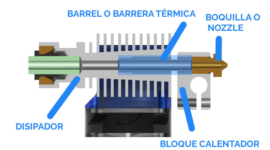 Comenzaremos explicando que es un nozzle o boquilla. El nozzle se ubica en la parte inferior del hotend o cabezal de impresión y es el punto por el que el filamento fundido es expulsado a nuestra impresión.