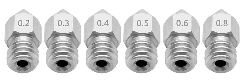 Para un uso en piezas funcionales normalmente usamos diámetros 0.4-0.6mm (bien ajustado el perfil de impresión no veremos diferencias entre ambos a misma altura de capa y si un ahorro de tiempo de impresión además de permitirnos trabajar con mayores alturas de capa) de acero endurecido y a ser posible revestido/bañado.