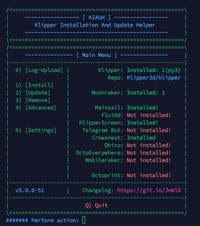 Desde la consola dispondremos de unos menús para poder ver que tenemos instalado y gestionar instalaciones, actualizaciones, eliminar módulos de Klipper además de opciones especiales avanzadas.