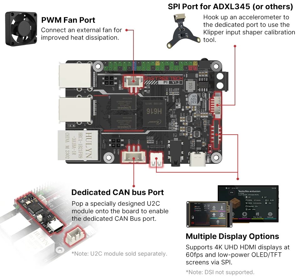 Fast Ethernet 100Mbps WiFi 2.4G/802.11 b/g/n USB2.0x4 USB Type-Cx1 ADXL345 Accelerometer (* ADXL345 sensor not included) Port USB/CAN (* require USB adapter not included) IR Receiver