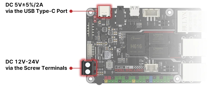 DC 5V/2A from USB Type-C DC 12/24V from Power connector