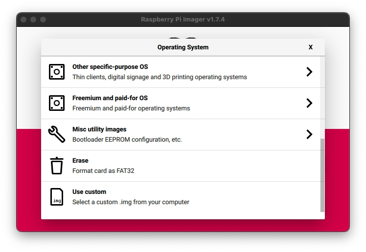 Para esta guía usaremos RatOS que es la distribución de Klipper que solemos usar normalmente. Los pasos son muy sencillos, una vez tengamos abierto Raspberry Pi Imager, seleccionaremos Use custom y elegiremos nuestra imagen a aplicar en nuestra SD,