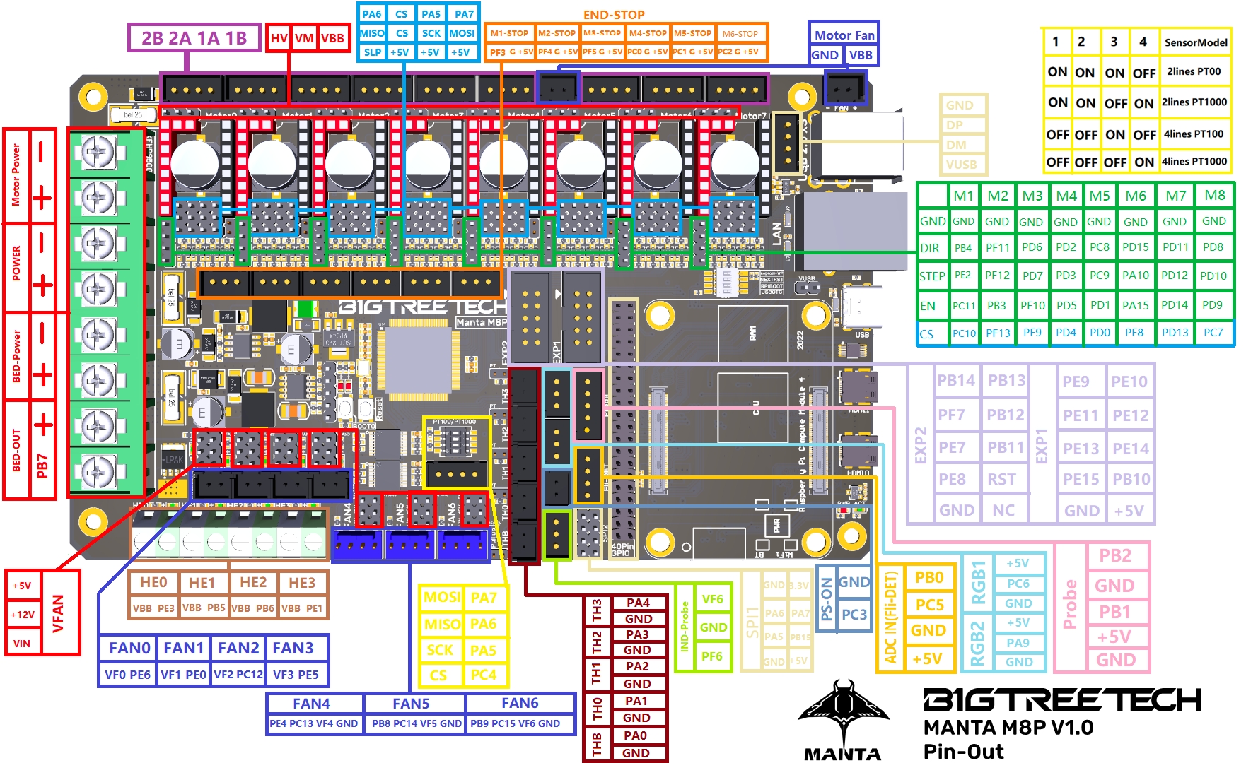 con la Manta M8P contamos con un arsenal de puertos para ventiladores: con 4 de ellos de dos pines estandard (PWM) (FAN0, FAN1, FAN2, FAN3), 3 con cuatro pines (tacometro) (FAN4, FAN5, FAN6)... todos controlables desde firmware ademas de disponer de seleccion de voltaje entre 5-12-24V... y dos no controlables con alimentacion constante.