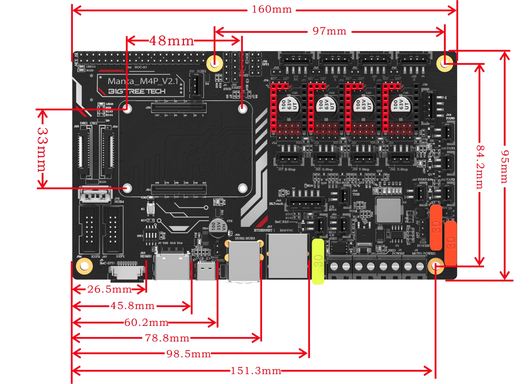 Diferente MCU, mientras que la Manta M4P monta un ARM Cortex-M0+STM32G0B0RE 64MHz la Manta M8P usa una versin mejorada ligeramente ARM Cortex-M0+STM32G0B1VET6 64MHz que en cualquier caso va a tener un desempeño mas que suficiente tanto en uso con Marlin como con Klipper.