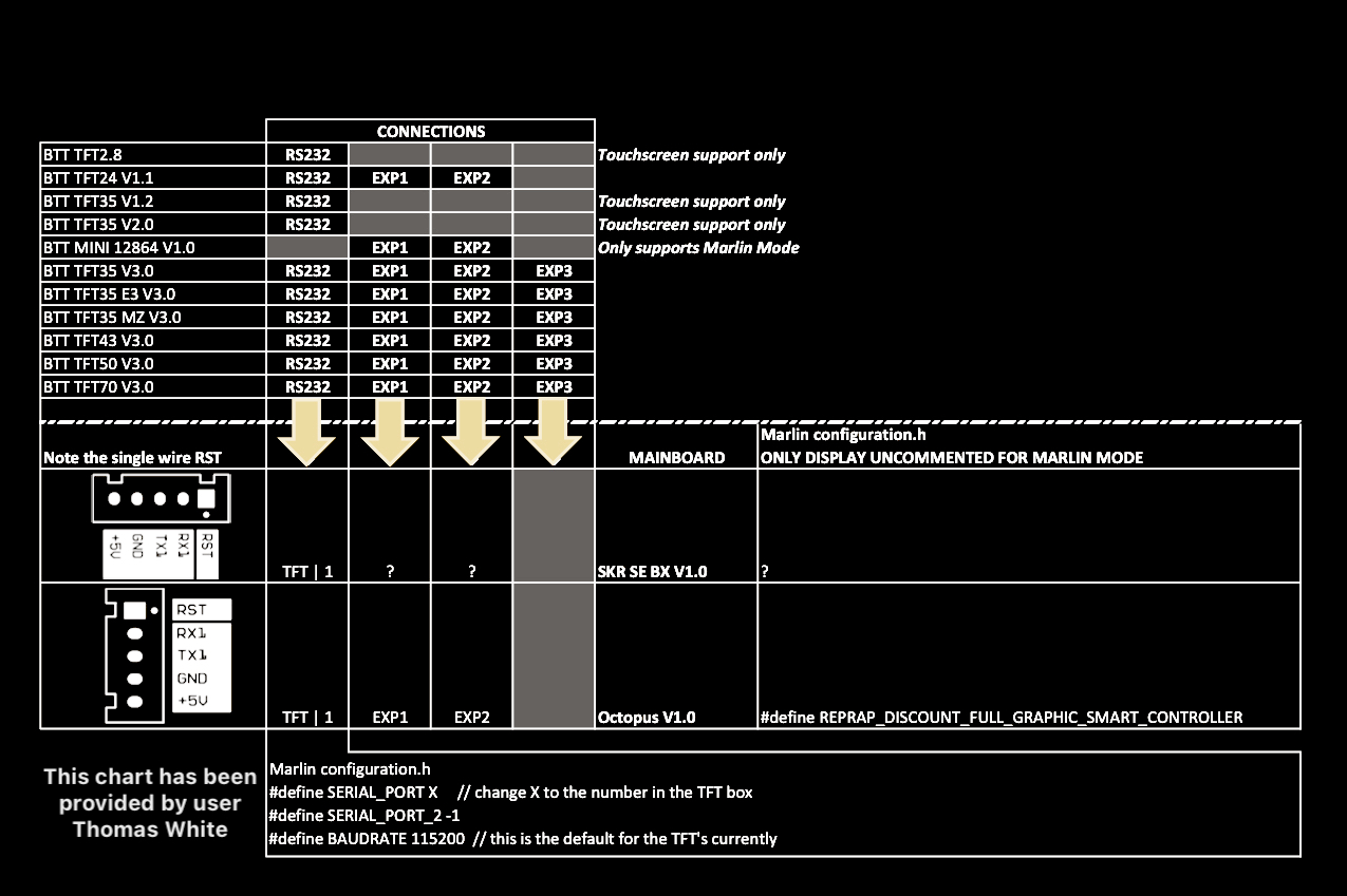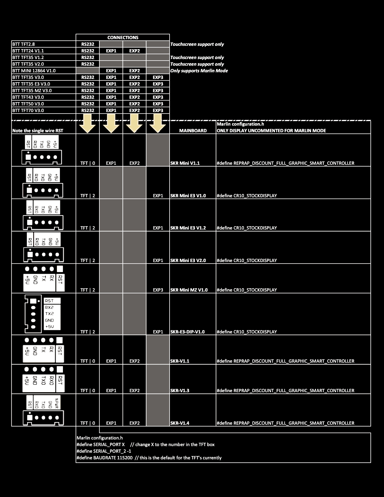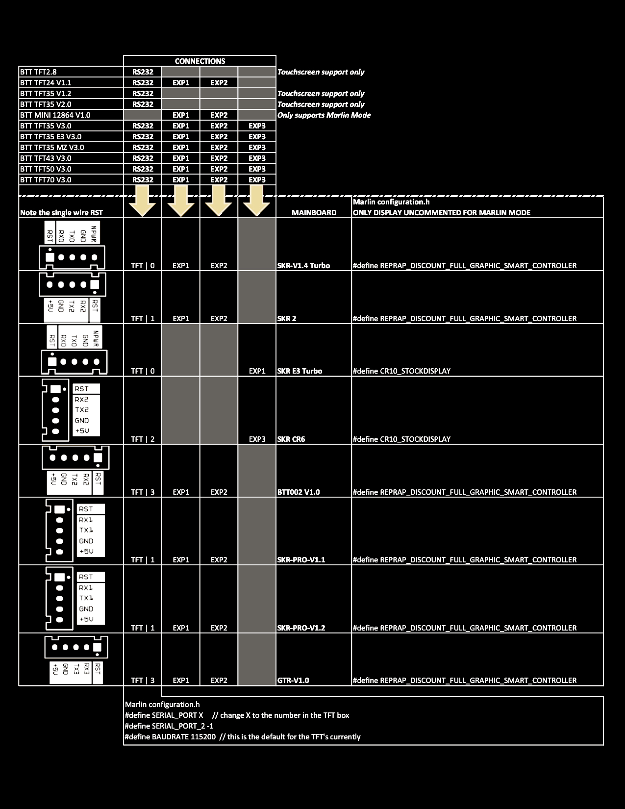 BTT_TFT24_V1.1 BTT_TFT28_V1.0 and V3.0 BTT_TFT35_V1.0, V1.1, V1.2, V2.0, V3.0, E3_V3.0 and B1_V3.0 BTT_TFT43_V3.0 BTT_TFT50_V3.0 BTT_TFT70_V3.0