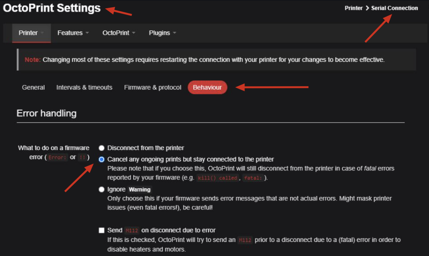 Para mejorar la gestión de errores, sobretodo M112, y evitar fallos raros/random de impresora es aconsejable cambiar esta configuración dentro de Octoprint: