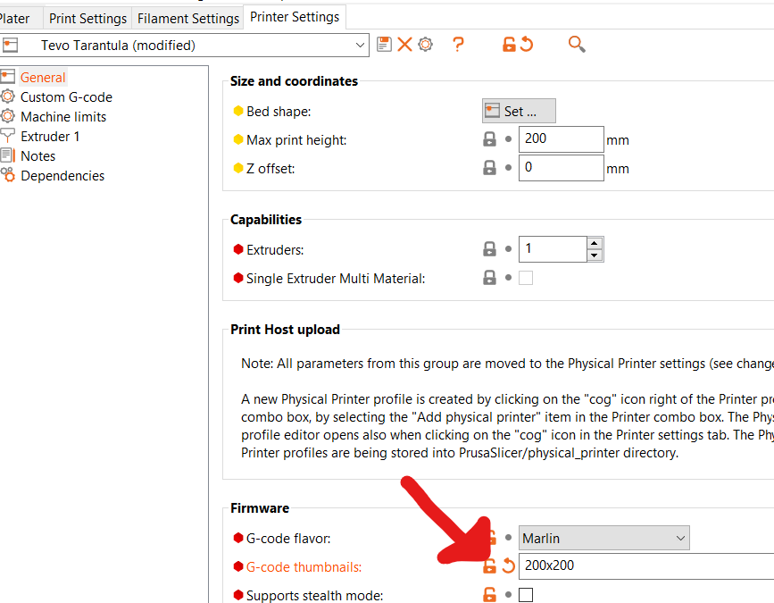 Abriremos PrusaSlicer/SuperSlicer y nos vamos al perfil de nuestra impresora en General configurando el valor XXXxXXX en Miniaturas de código Gcode tal como puedes ver en la siguiente captura: