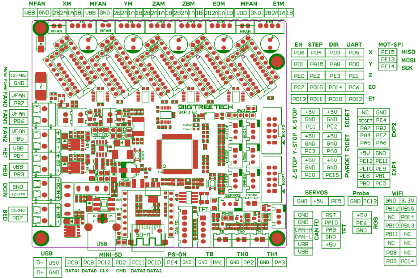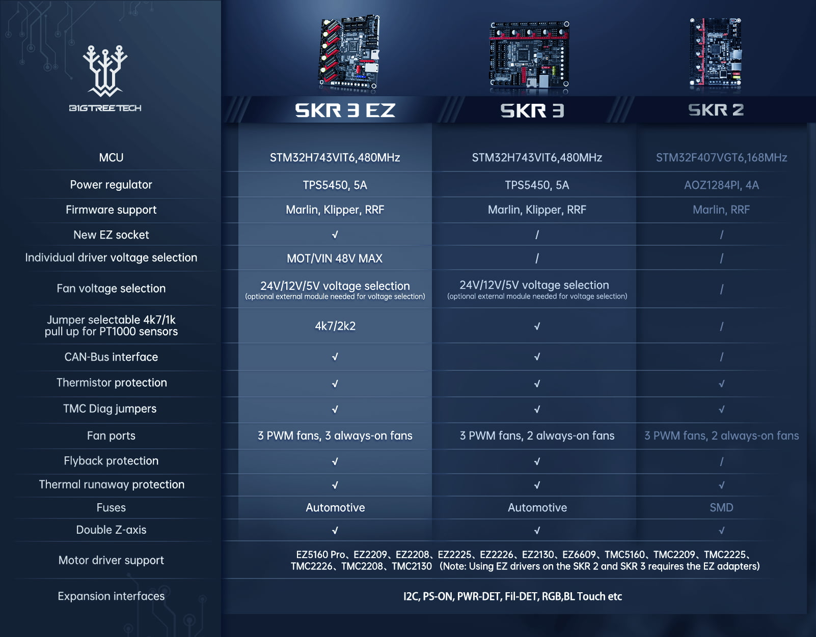En el caso que quieras mejorar tu máquina con drivers/motores HV (hasta 48v) solamente la SKR 3 EZ te va a dar un soporte nativo para ellos.