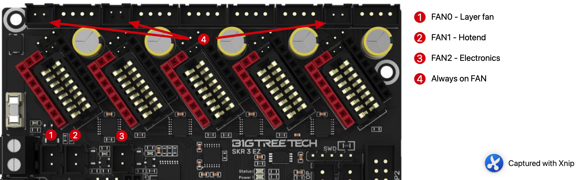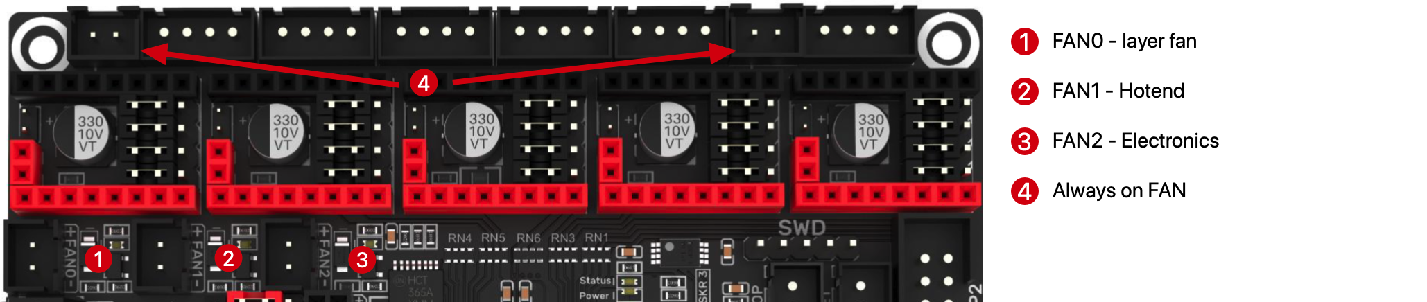Como ya os adelantamos la serie SKR 3 cuenta con 3 ventiladores controlables perfecto para usarlos en diferentes roles, como ventilador de capa o hotend o electrónica, o de repuesto en caso que alguno se estropee.