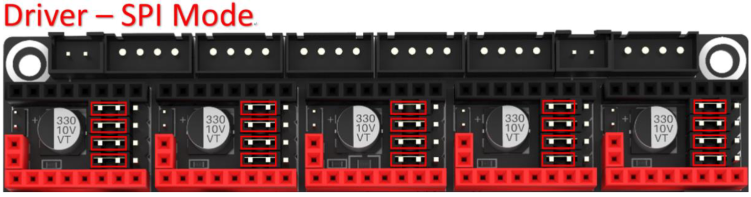 Para indicar a la electrónica que nuestros drivers usarán SPI lo haremos ajustando los jumpers siguiendo el siguiente esquema.
