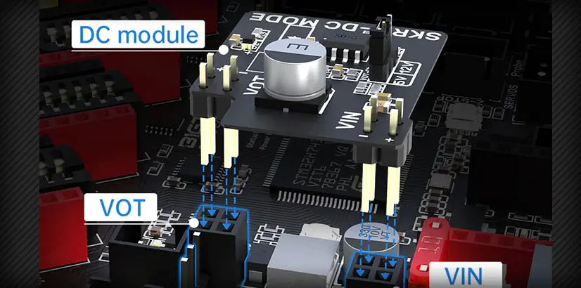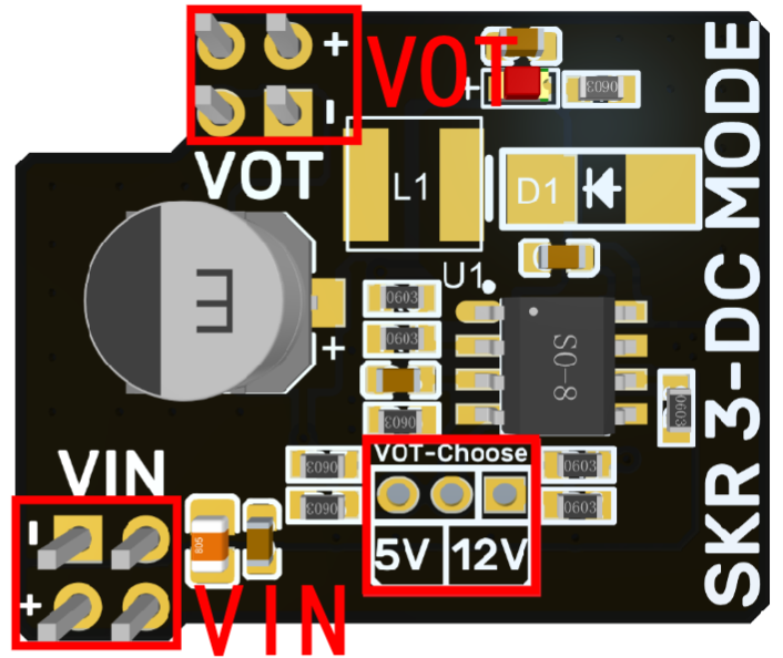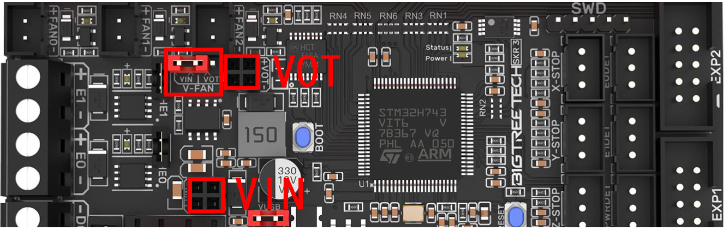 Para poder utilizar este módulo externo lo primero será colocar el jumper de selección de voltaje de ventiladores en la posición VOT, en la posición VIN usará el voltaje de nuestra fuente de alimentación. Mediante el módulo SKR 3-DC MODE podremos seleccionar entre 5v o 12v mediante un jumper.