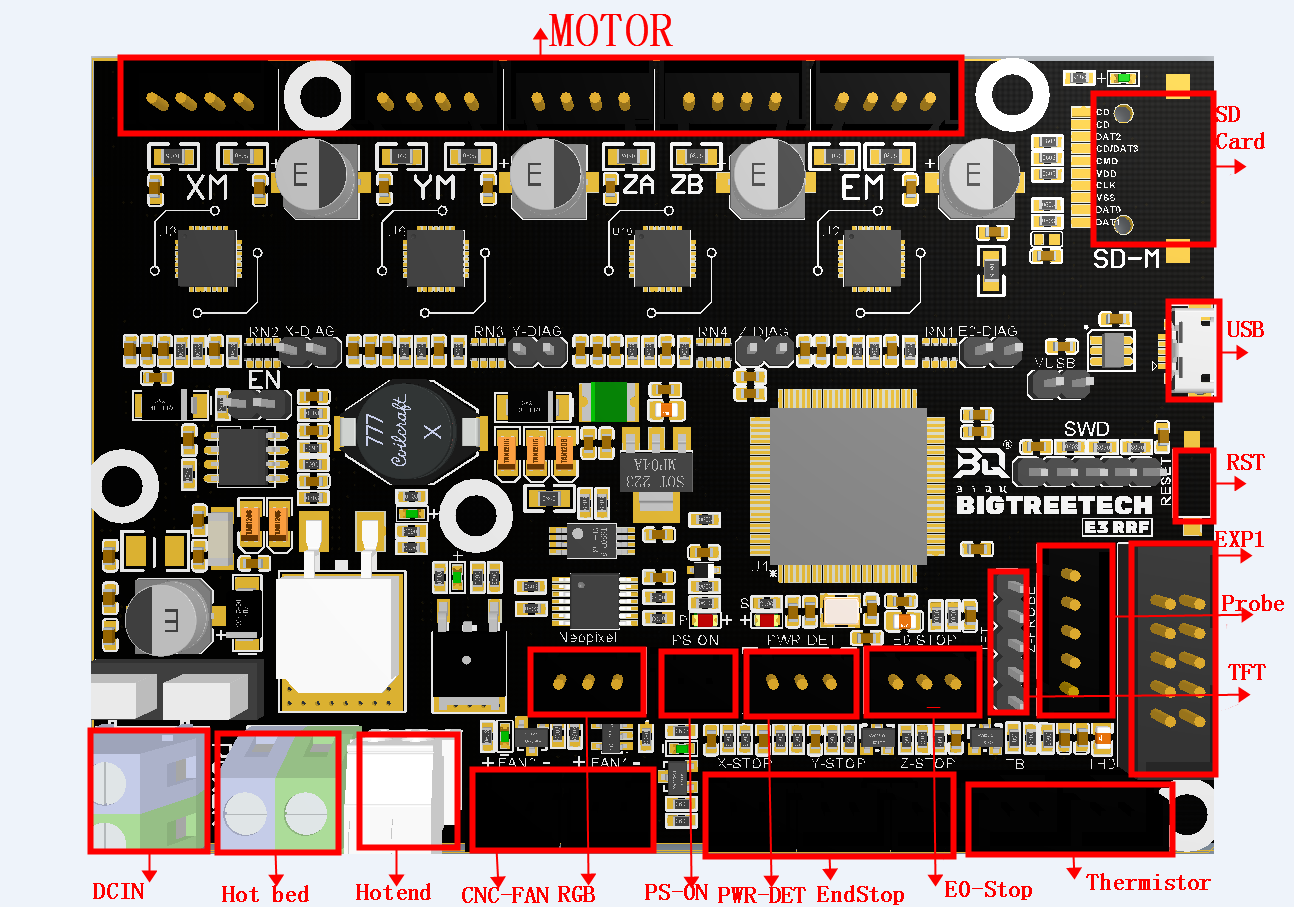 Al igual que la SKR E3 Turbo esta SKR E3 RRF tiene algunos cambios en la orientación de cables con respecto a su hermana SKR MINI E3 v2. Especialmente en la zona de alimentación.