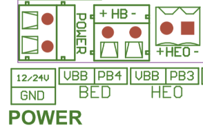 Normalmente tanto la conexión de los calentadores para la cama como del extrusor no suelen tener polaridad. En todo caso sigue el orden que tengas actualmente o los colores de los cables, en especial si cuentas con un MOSFET externo ya que para estos si que suele importar la polaridad.