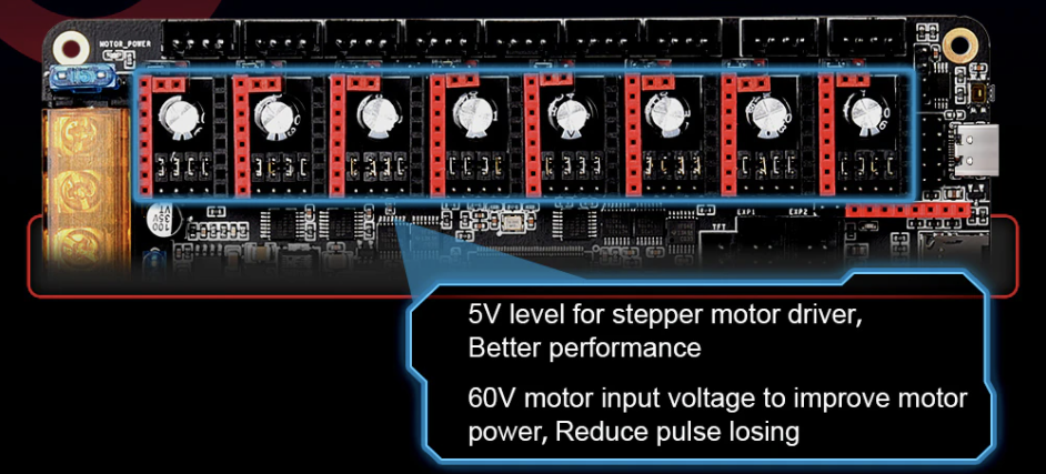 Soporte para motores de hasta 60V teóricos aunque en el caso de usar sobre una Octopus PRO aconsejamos trabajar con sistemas de 48V. Voltajes recomendados 12-24-36-48-56 V
