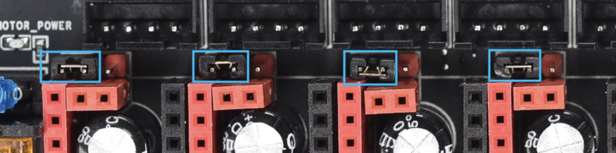 En el caso que usemos drivers HV colocaremos el jumper en la parte izquierda haciendo que la alimentación de nuestros drivers usen la entrada de corriente MOTOR POWER IN que podremos alcanzar hasta 60V.