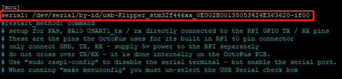 Modificar la configuración de [mcu] en printer.cfg a serial: /dev/ttyAMA0 y habilitar restart_method: command