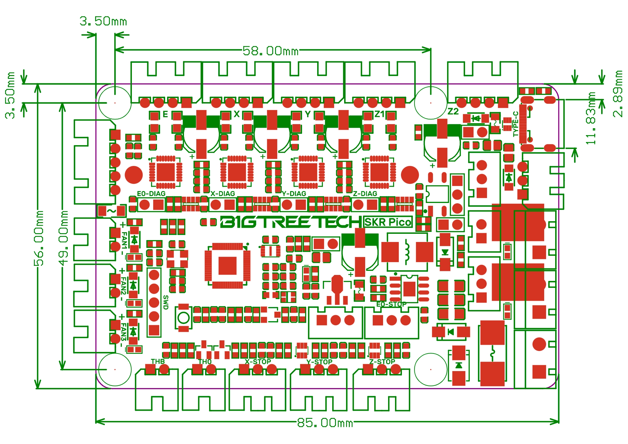 Diseño compacto, el tamaño de esta SKR Pico la hace perfecta para integrarla en cualquier impresora además de que la mayoría de sus conexiones son laterales facilitando su integración con Raspberry Pi y mejorando el acceso y refrigeración general