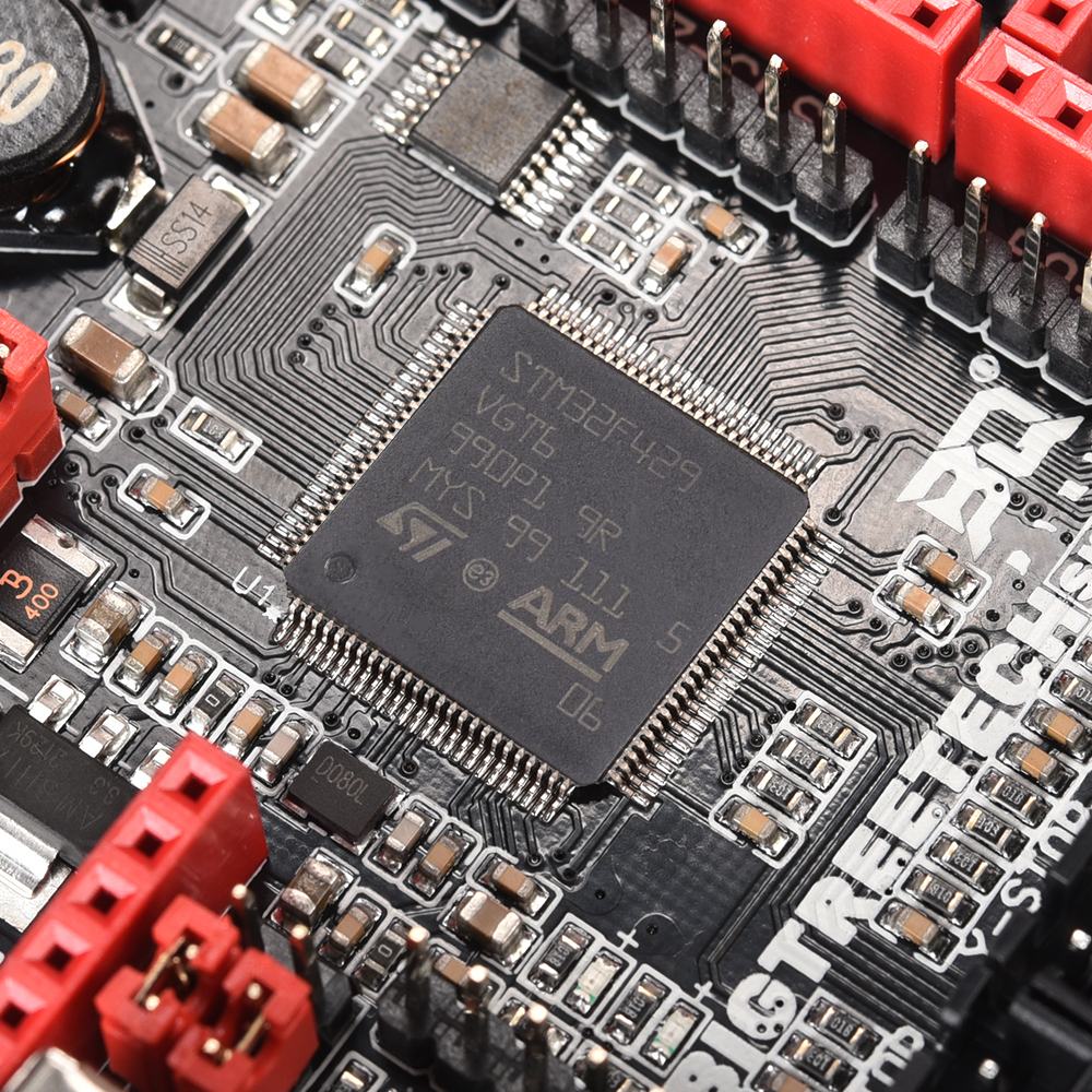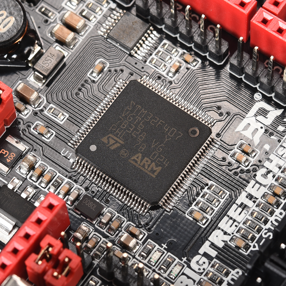 MCU, mientras que sus hermanas SKR 1.3/1.4 montaban MCUs LPC176* la SKR v2 ha mejorado este aspecto incluyendo una MCU ARM Cortex-M4 STM32F407VGT6 a 168Mhz que dará una potencia extra a nuestra impresora.