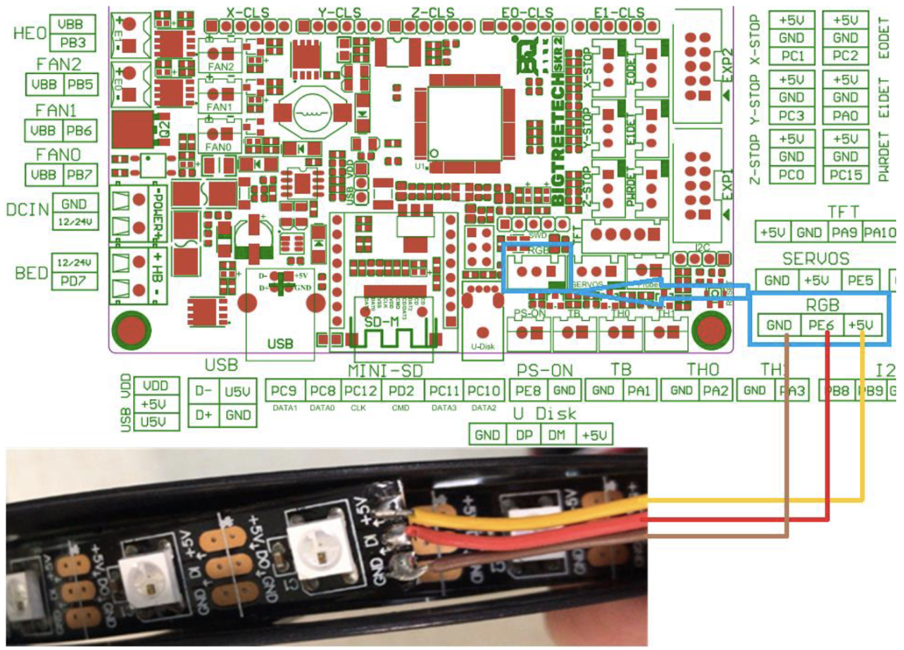 Aunque no es una mejora directamente en el uso de la impresora si que es muy útil la inclusion de una tira led controlable ya sea como iluminación de la zona de impresión así como la gestión de eventos. Os animamos a revisar la guía de Neopixel donde encontraréis más información detallada.