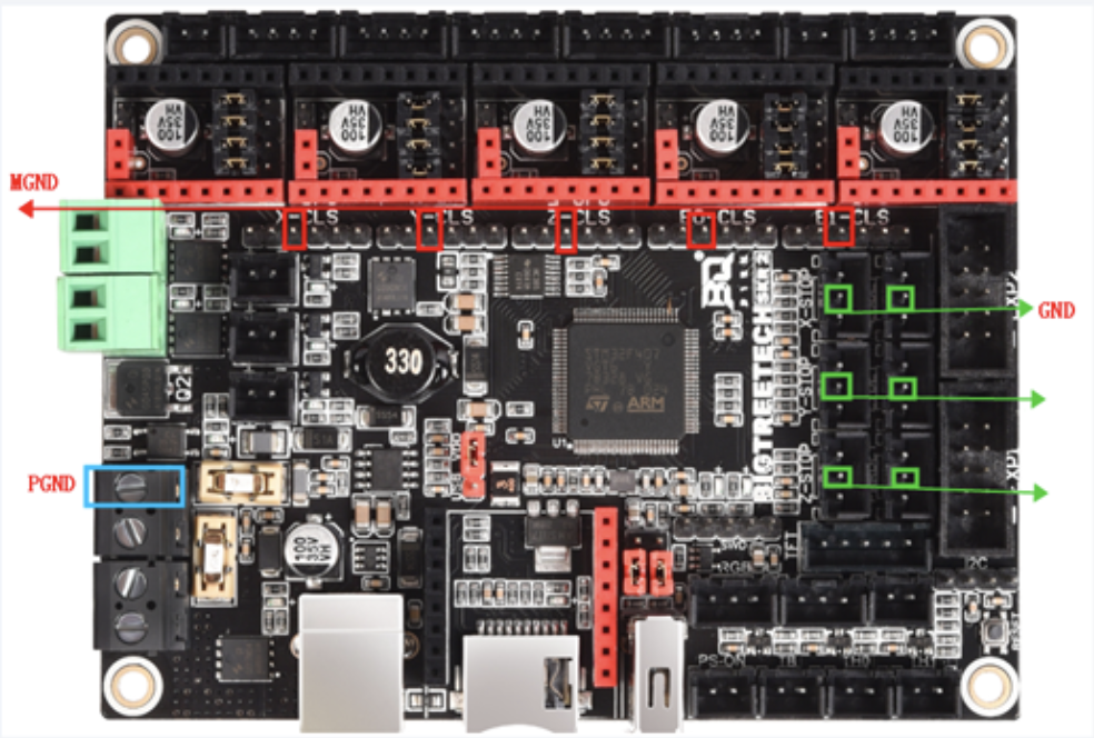 Existe un par de "workarounds" para usar estas placas sin ningún tipo de problemas, el primero sería realizar un par de pequeños puentes entre MGND y PGND siguiendo el esquema siguiente.