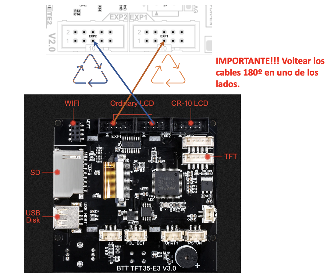 En este caso la conexión si bien es entre EXP1 y EXP2 al correspondiente de la placa este tiene que girarse en uno de los extremos 180º para ambos cables