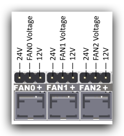 Para ello deberemos poner el jumper correspondiente entre FAN0/1/2 Voltage y el voltaje que queramos usar. En el siguiete diagrama podremos verlo fácilmente.