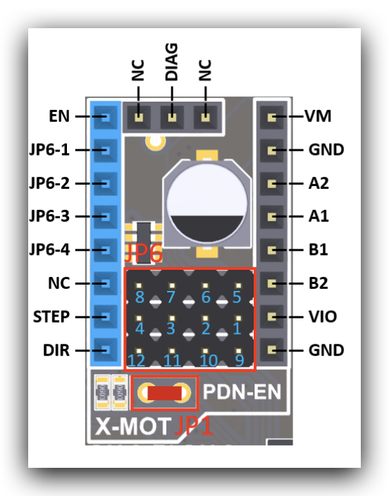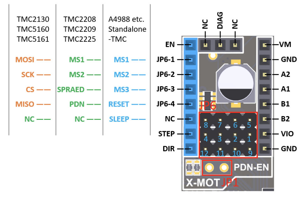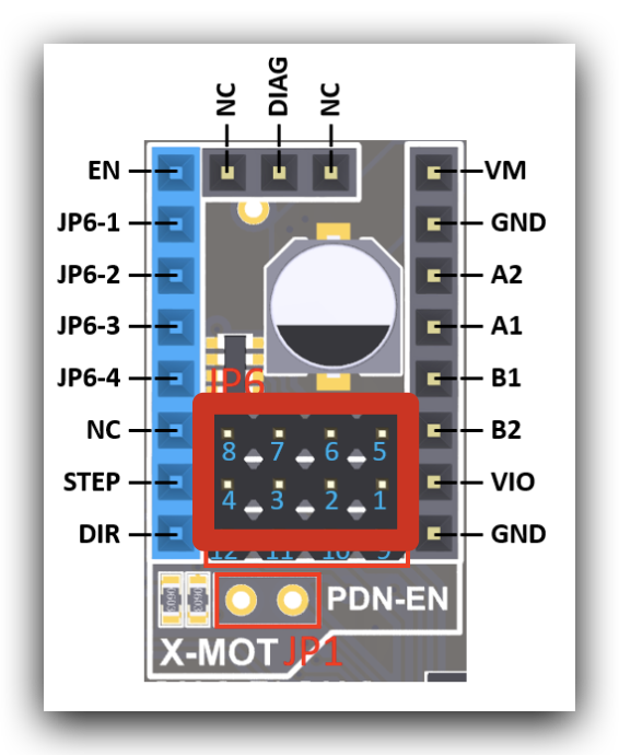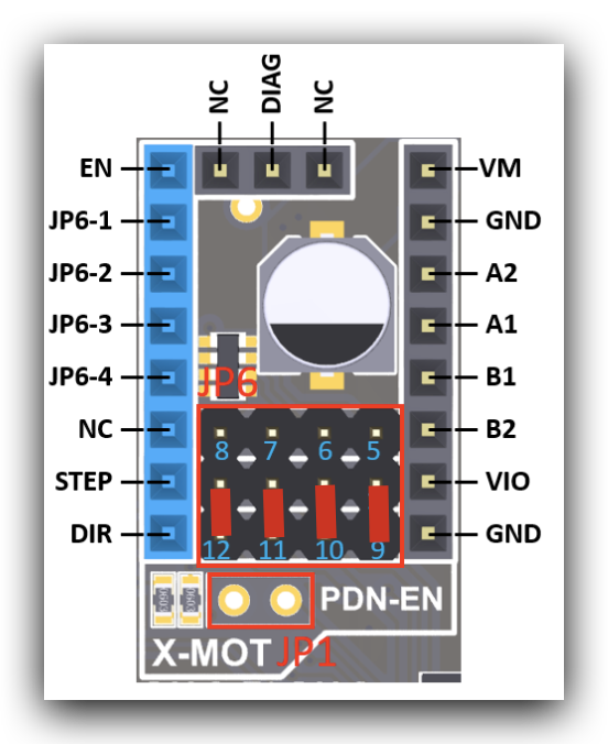 Para la configuración de drivers en modo STANDALONE (simple) necesitamos usar los pines del conector JP6 (1234-5678) para configuración de microsteps y alguna funcionalidad en drivers TMC según se muestra en el esquema anterior.