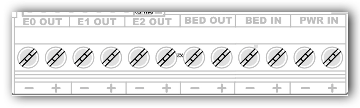 Tal como hemos comentado anteriormente esta placa dispone de un arsenal de conexiones y opciones así que la parte de alimentación no podría ser menos contando con las 3 salidas para extrusores, otra más para la cama... y con dos entradas de corriente una general y otra para la cama.