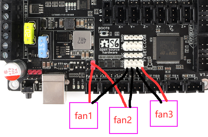 La Fysetc S6 cuenta con conexiones para 3 ventiladores gestionables. Además de esta gran mejora al poder gestionar estos 3 ventiladores y tal como comentábamos en las características de esta placa podemos, sin necesidad de ningún convertidor de corriente, configurar para que las salidas del ventilador sean de 24v o 12v para aquellos casos que usemos ventiladores silenciosos para nuestra electrónica o hotend.