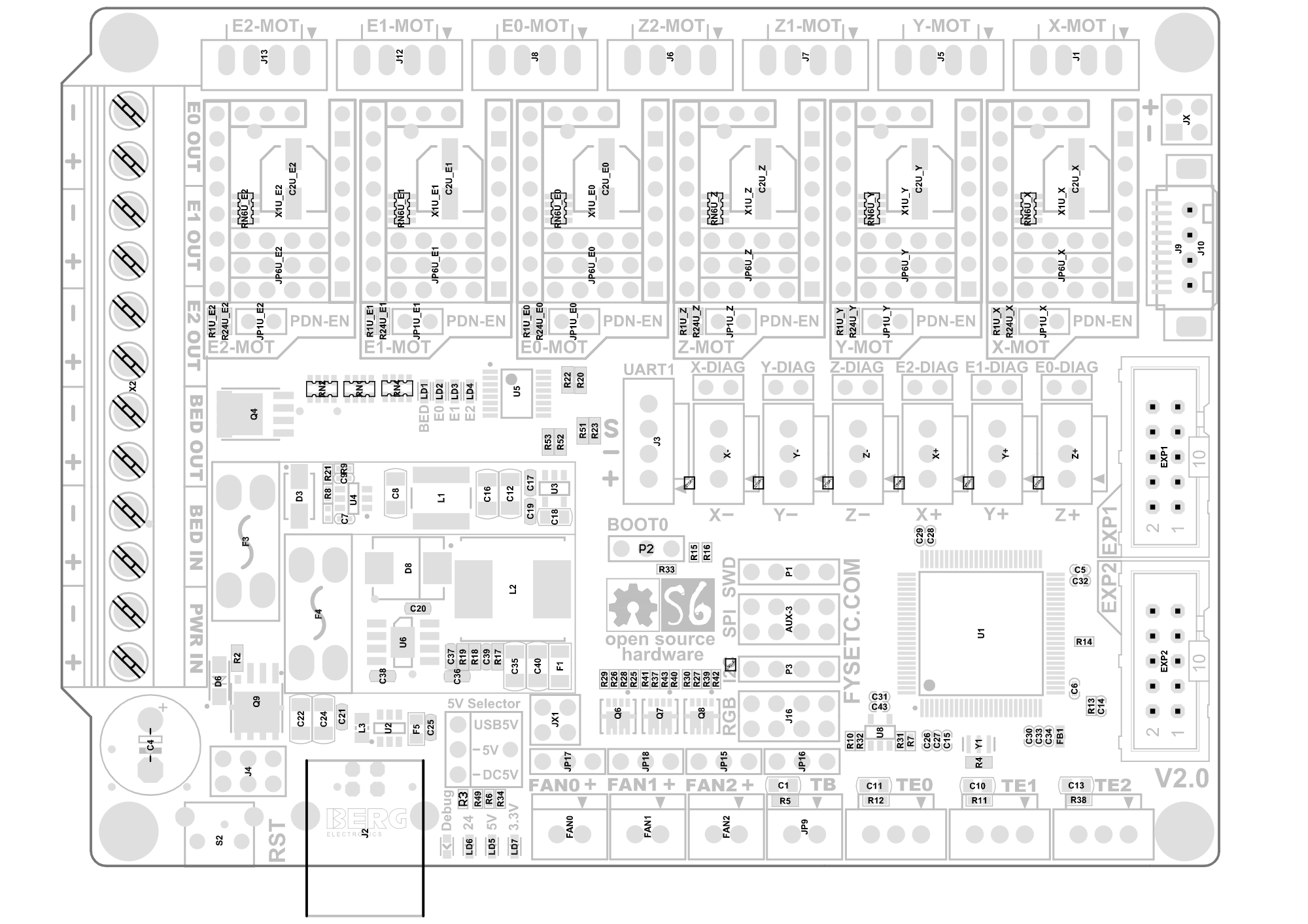 La Fysetc S6 dispone de una extensa configuración de jumpers/pins (JP1 y JP6) para poder soportar una gran variedad de drivers.