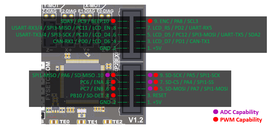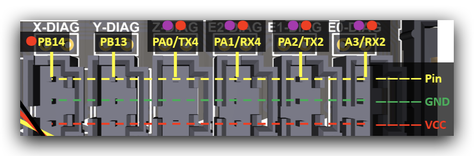 Otro aspecto importante sobre los conectores endstops es que disponemos de varios con funciones ADC (punto morado) y PWM (punto rojo) muy útiles para el uso de servos, leds o similares. En el siguiente esquema podremos ver el tipo de cada uno: