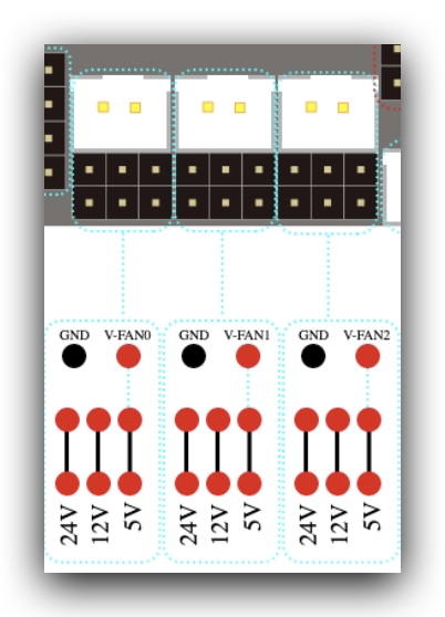 La Fysetc Spider cuenta con conexiones para 3 ventiladores gestionables. Además de esta gran mejora al poder gestionar estos 3 ventiladores y tal como comentábamos en las características de esta placa podemos, sin necesidad de ningún convertidor de corriente, configurar para que las salidas del ventilador sean de 24v o 12v para aquellos casos que usemos ventiladores silenciosos para nuestra electrónica o hotend.
