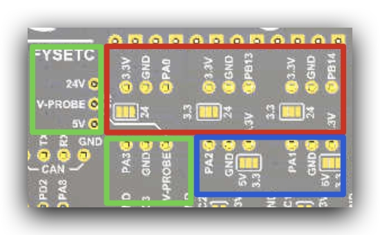 De nuevo Fysetc ha implementado mejoras muy interesantes en los conectores de final de carrera donde con mucha frecuencia conectamos sensores de nivelación que pueden requerir de diferentes voltajes así que se han incluido unos jumpers (mediante puente de soldadura) para que podamos escoger el voltaje que entregará cada conexión.