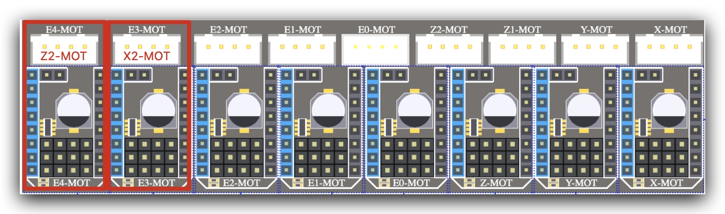 En el caso que queramos usar doble driver para los ejes de X y Z es importante que (actualmente en versiones 2.0.8.x) deberemos de colocar el segundo driver en los zócalos siguientes: