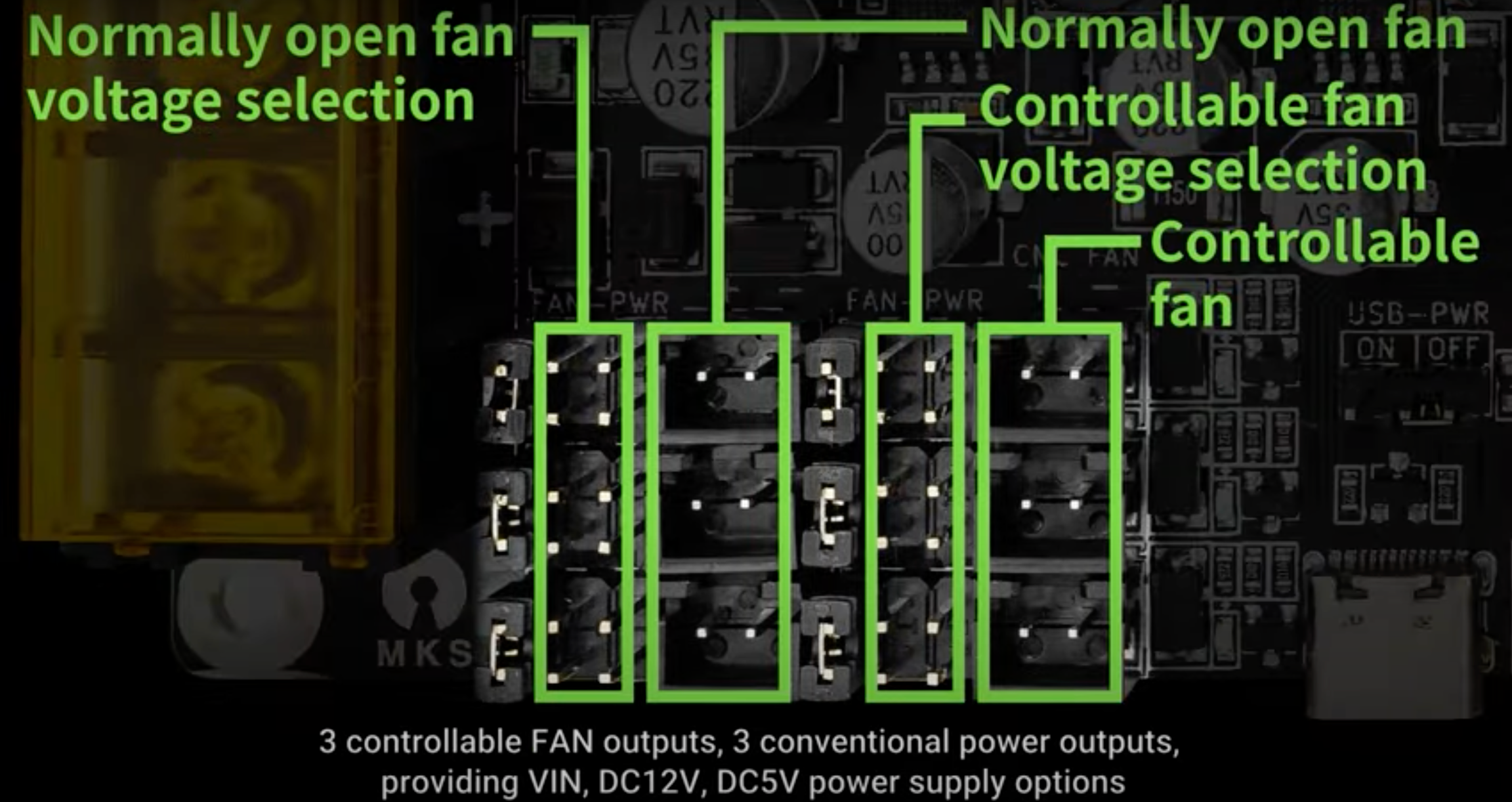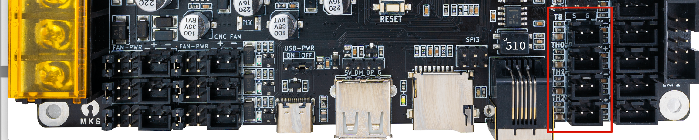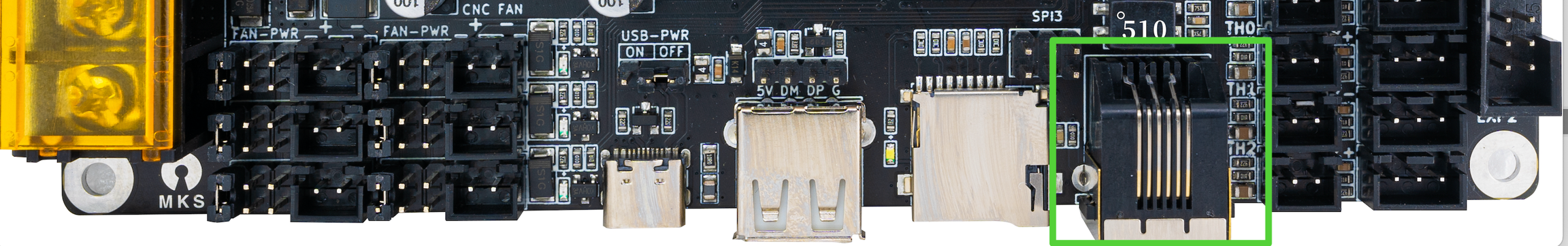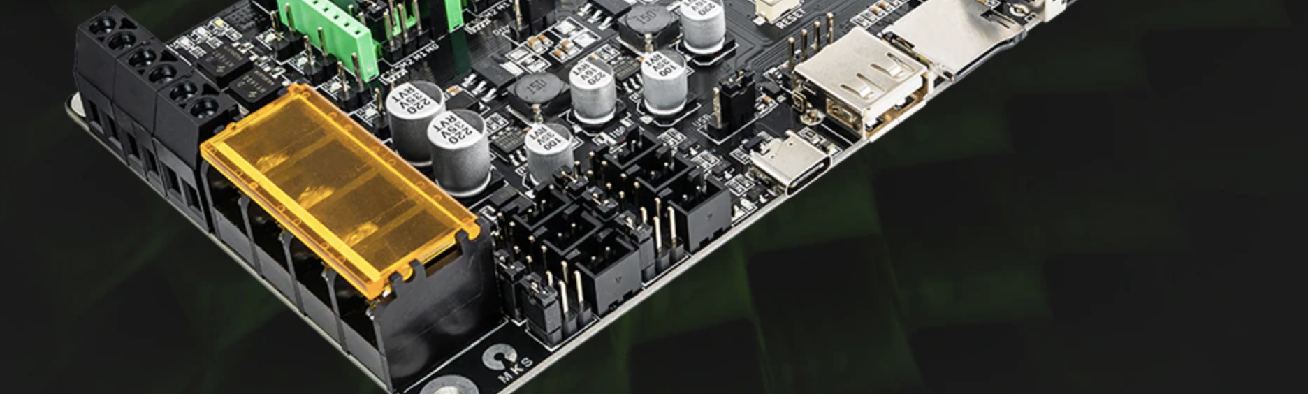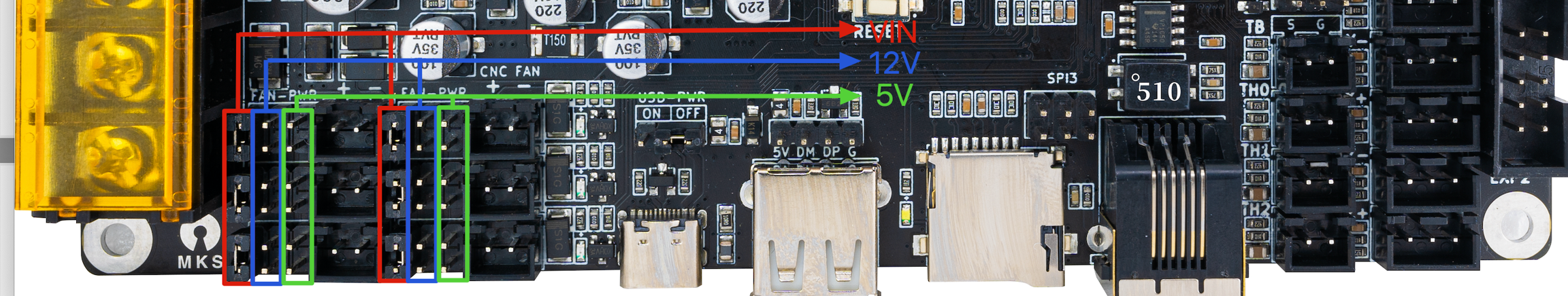 La MKS Monster8 cuenta con un jumper para la selección de alimentación para la electrónica usando el puerto USB-C, con este pin conectado mediante un jumper la placa se alimentará por el puerto USB-C para realizar tareas de actualización de firmware o tests básicos.