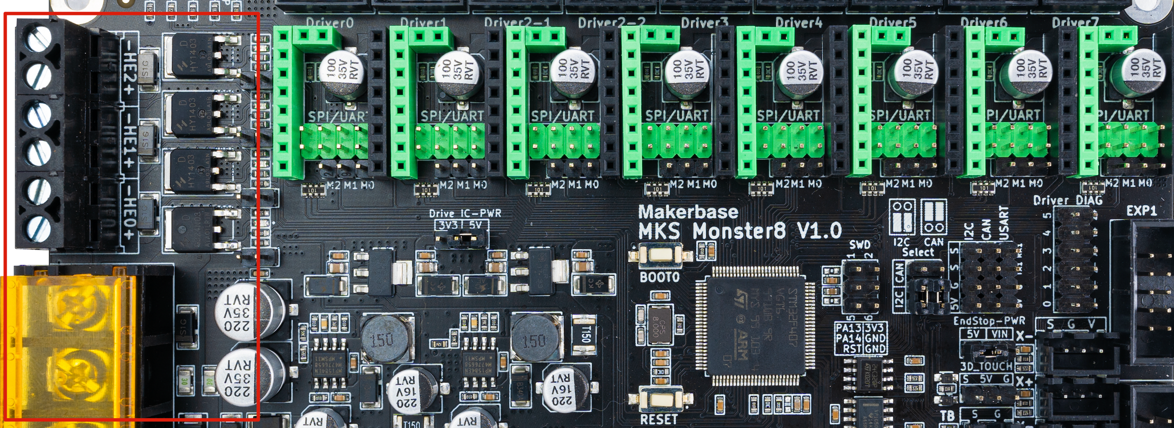 La MKS Monster8 cuenta con 8 zócalos para drivers haciendola una electrónica perfecta para máquinas exigentes como pueden ser las impresoras CoreXY o similares.