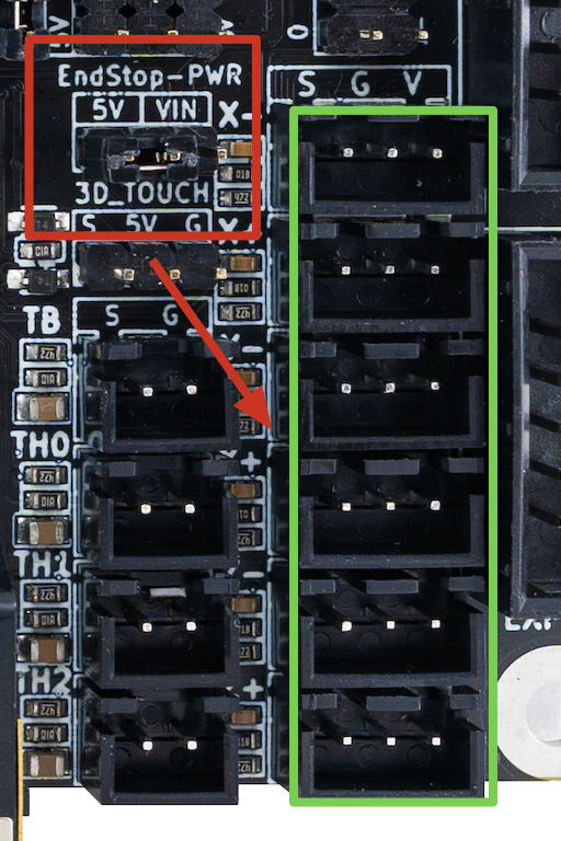 Es importante mencionar que contamos con un jumper para seleccionar la alimentación de voltaje de los conectores endstop entre 5v (defecto) y VIN... es importante tener este jumper conectado donde corresponda!!!
