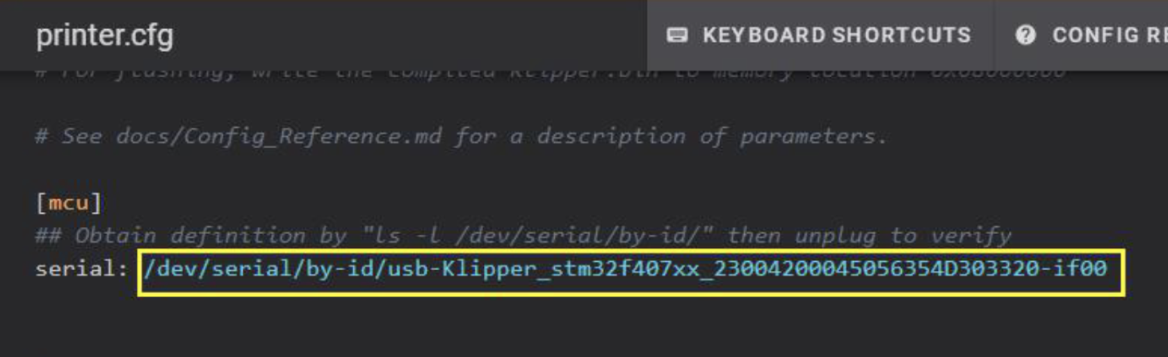 Si vamos a usar USB-C para comunicar Klipper con Monstr8 ejecutaremos el siguiente comando desde Klipper ls /dev/serial/by-id/*, desde Kiauh disponemos desde su menú de una forma rápida y sencilla para ejecutar esta acción, para identificar el ID correcto de nuestra Monster8 y añadirlo a nuestro printer.cfg
